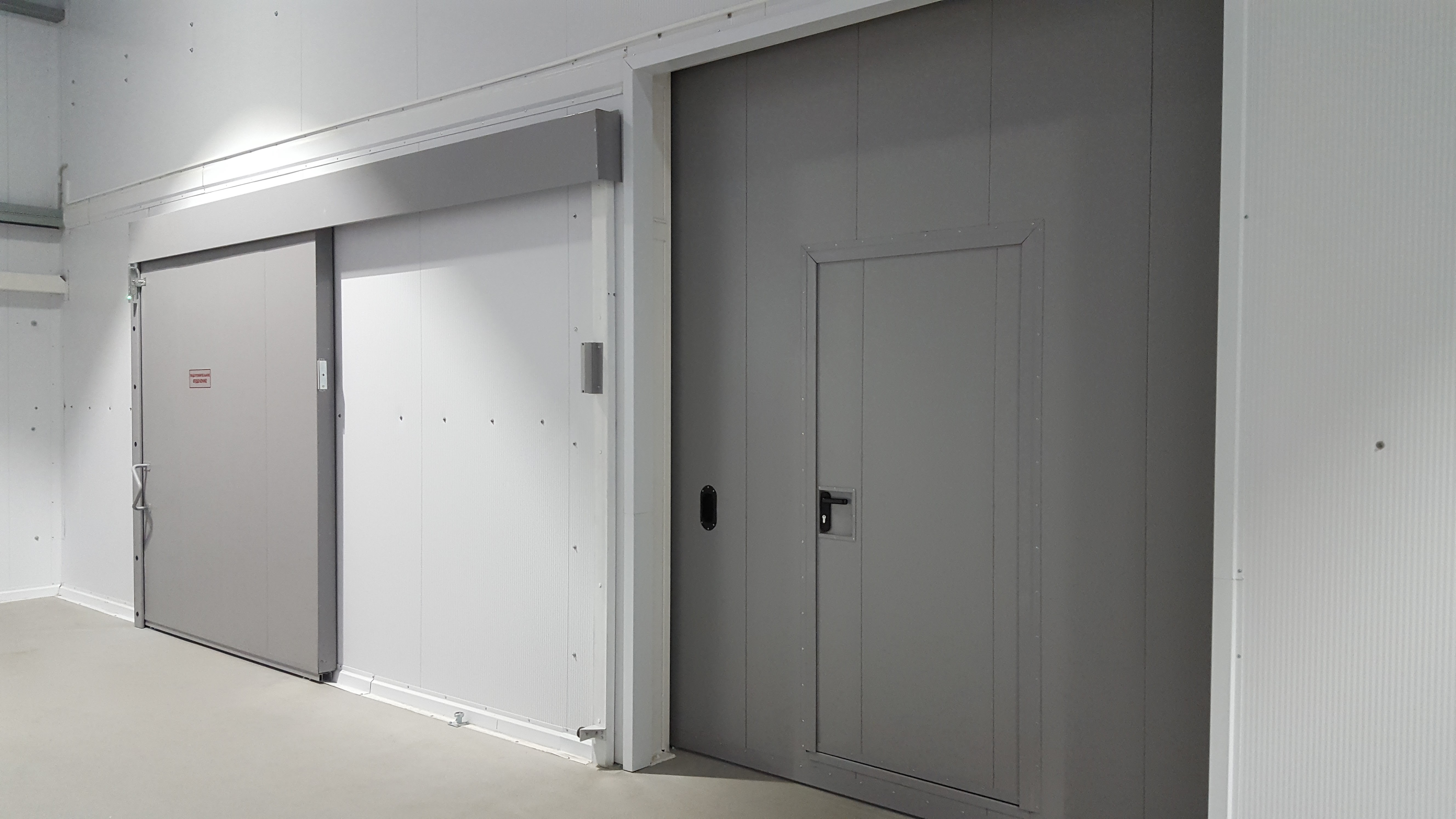 Двери для холодильных камер изготовлены из сэндвич-панелей с герметичным контуром, что эффективно решает проблему разницы температур между камерой и основным помещением.